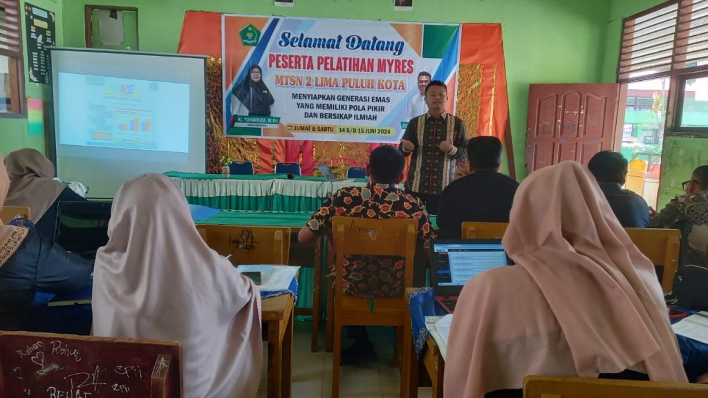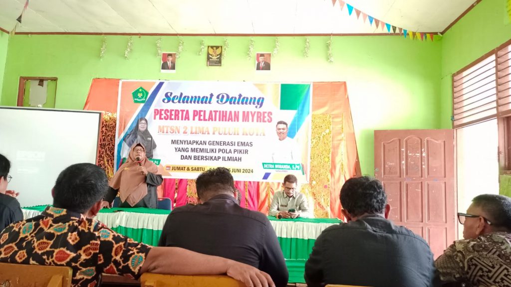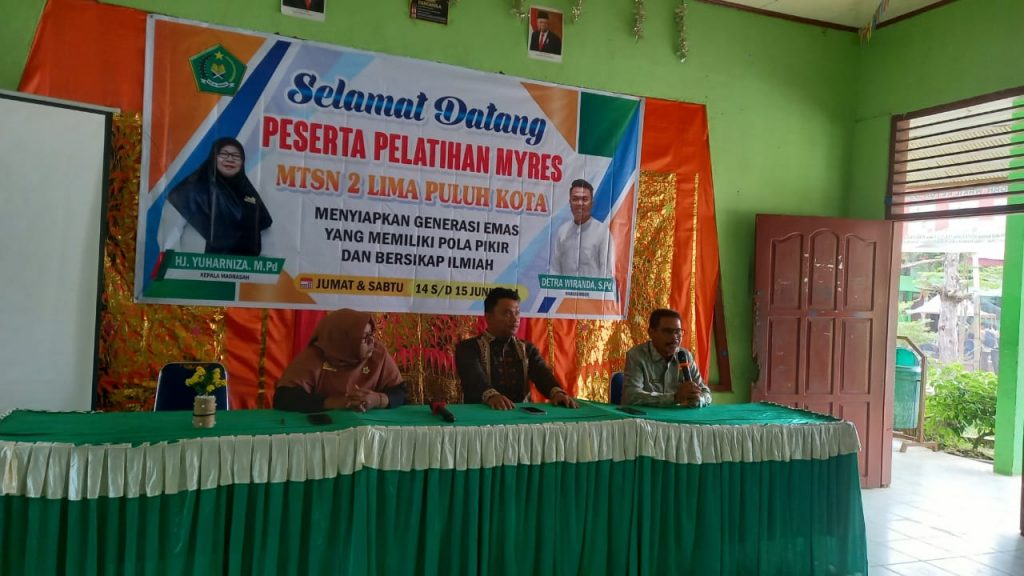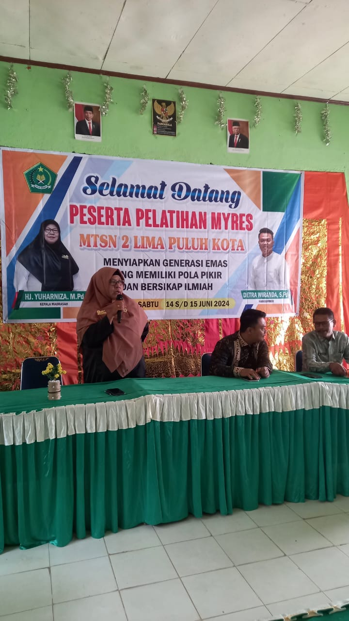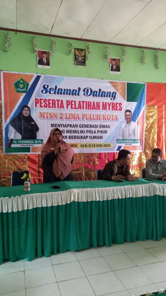 Kegiatan Pelatihan MYRES dibuka oleh Kepala MTsN 2 Lima Puluh Kota Hj.Yuharniza,S.Pd. Beliau memberikan apresiasi dan terima kasih kepada seluruh majelis guru dan pihak terkait atas terlaksananya acara Pelatihan ini dengan baik.